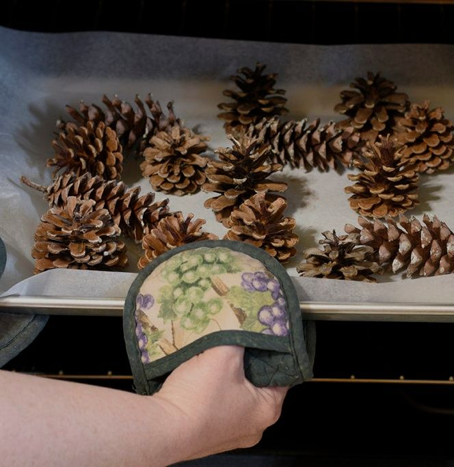 Let the cones cool completely before using them. Pine cones and pine resin are highly flammable. It’s very important to bake them at a low temperature and check them frequently.