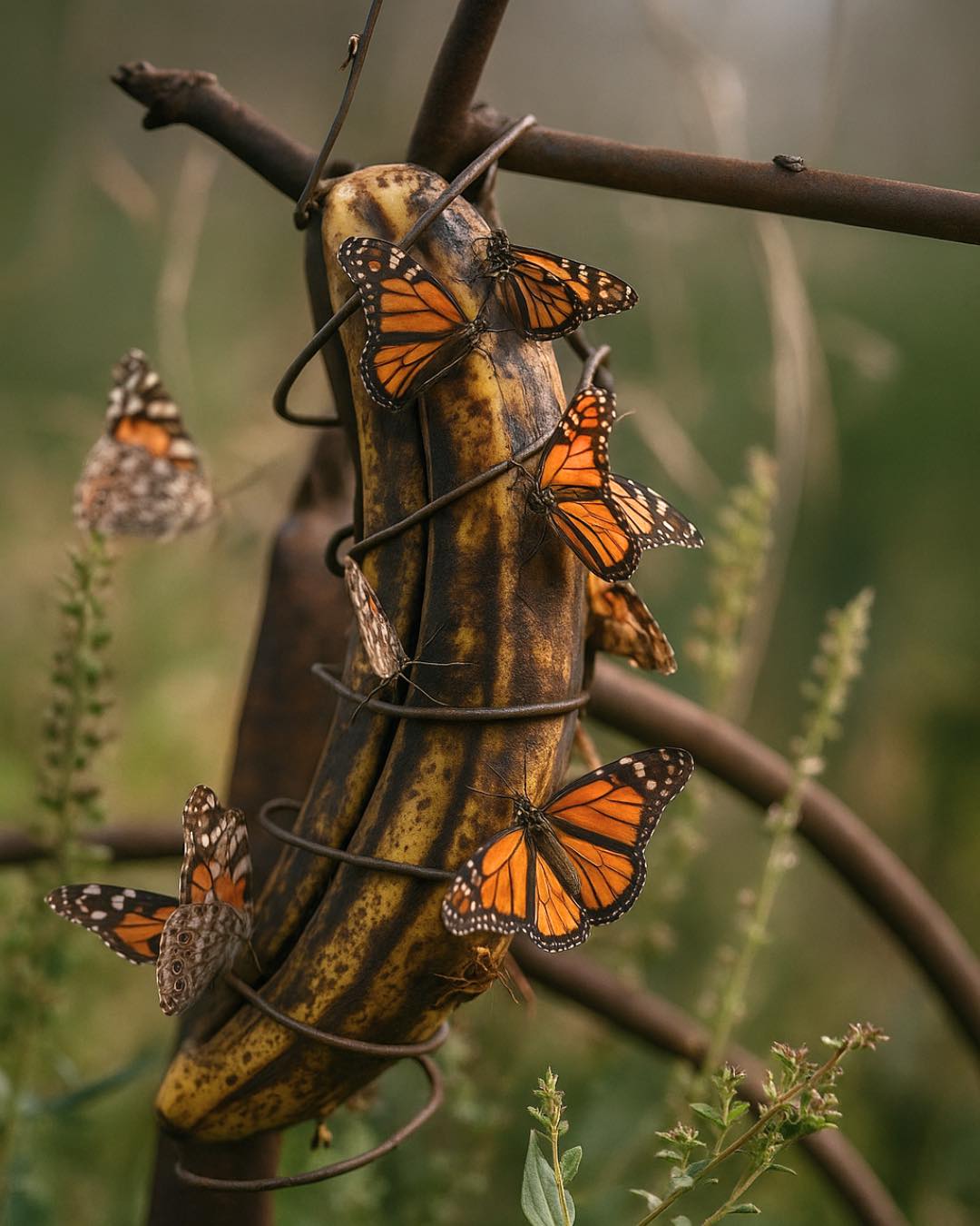 Butterflies will gather on the banana, sipping its juices. This not only nourishes them but creates a delightful spectacle in your garden.