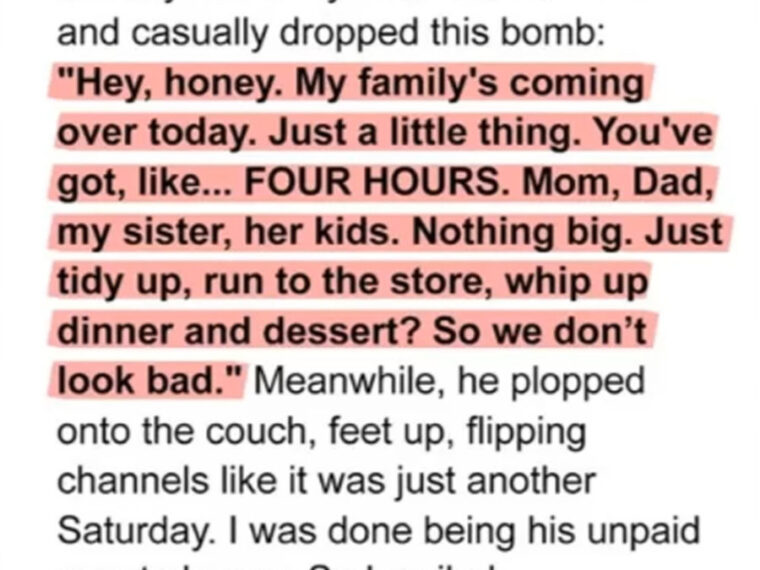 It was a peaceful Saturday morning, and I was enjoying some downtime when he walked in with his usual smug grin and announced, “My family’s coming over in four hours. Just a small thing.”