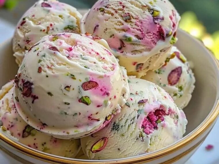 It combines the delicate floral aroma of rose water, the creamy tang of cheesecake, and the satisfying crunch of pistachios—all in a no-churn format!