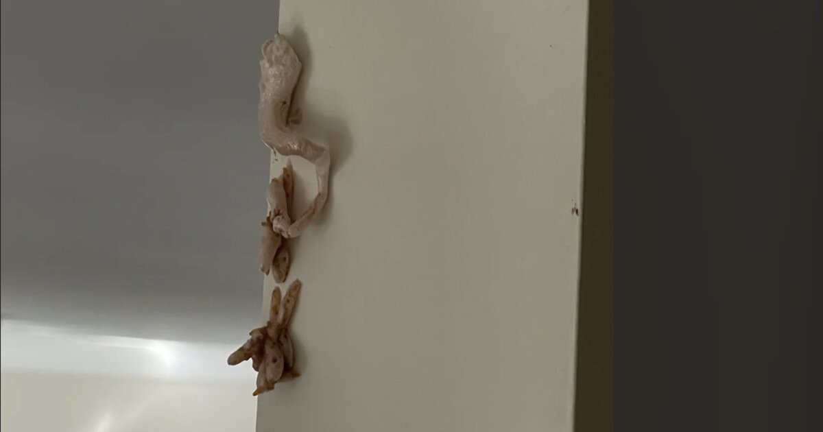 It was glued — glued — into the corner of the wall like it had grown there overnight. At first, my caffeine-deprived brain ran wild. Was it a mutant shrimp? A piece of Halloween candy that climbed out of the trash for revenge? Some kind of strange, wall-borne growth?