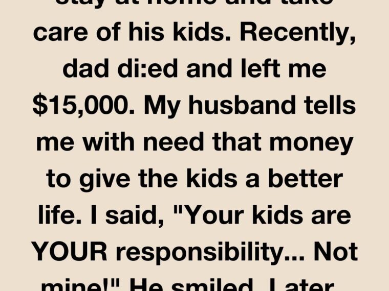 Recently, my dad di:ed and left me a $15,000 inheritance, and my husband tells me we need the money to give the kids a better life. I told him, “Your kids are your responsibility… Not mine! It’s NOT my responsibility to provide for them!”