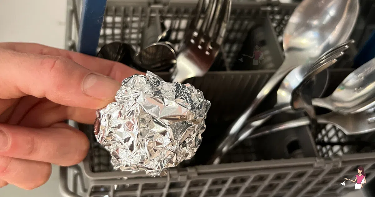 Place the foil ball in the flatware basket of your dishwasher along with your dirty cutlery.