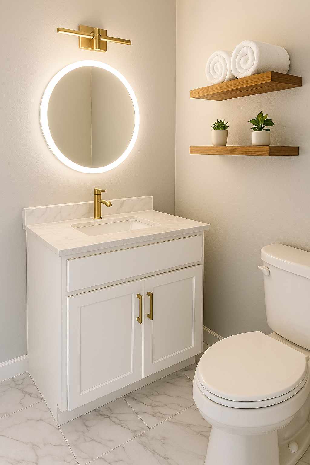Painting the walls soft sage green was the first game-changer. It made the space feel calm and open. The new LED mirror gave it that spa-like glow, and the floating shelves added much-needed storage without taking up floor space.